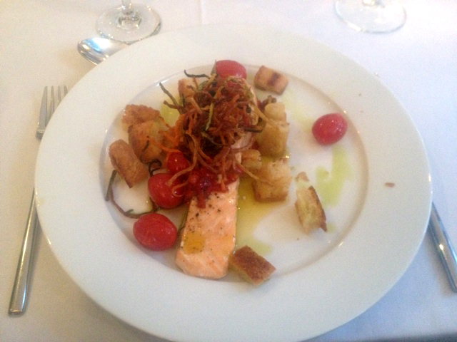 No, their main course was salmon, served with roast toms, deep fried courgette, carrot, croutons and tarragon oil. Many thanks to Ms T. Booth of South London for the snap. I think fish, toms and croutons are a combo I will return to again.